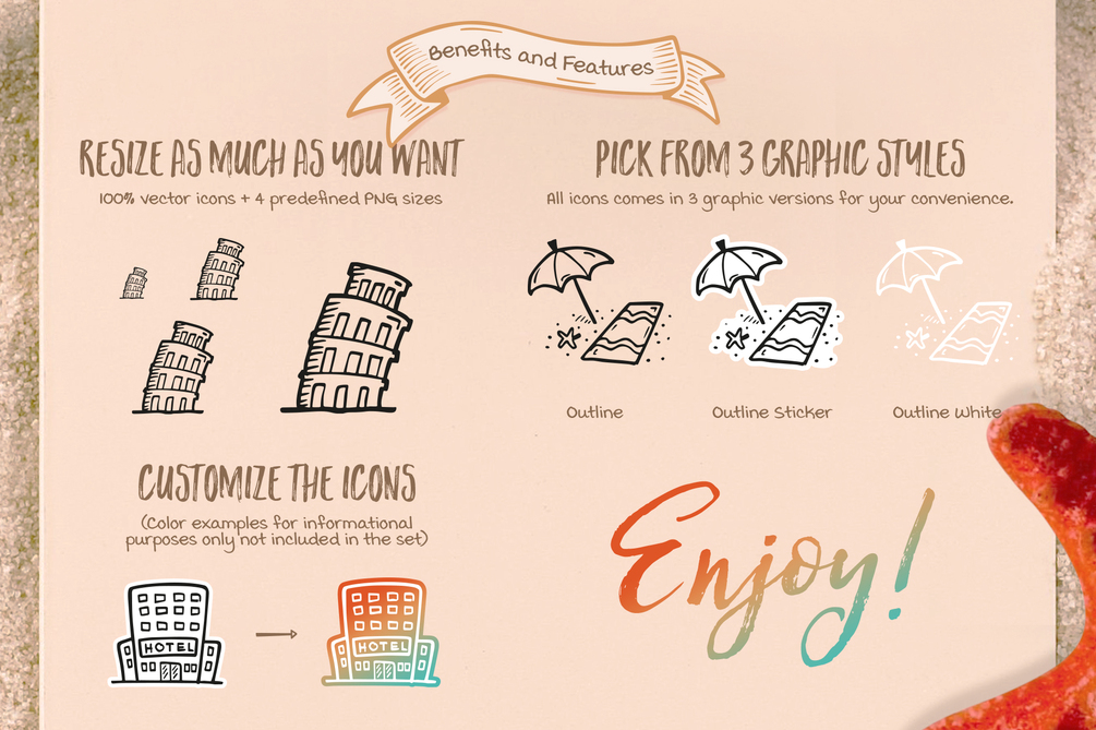65 Hand Drawn Vector Icons all about traveling and vacations. You will find there such useful transportation icons like a plane, boat, train or a car with a trailer. Or location icons like: sandy beach, forest, mountains or even a tropic island. There are also some memorable landmarks icons like: an Eiffel Tower or Statue of Liberty. So go ahead buy them now and start using to create fun and friendly looking designs.