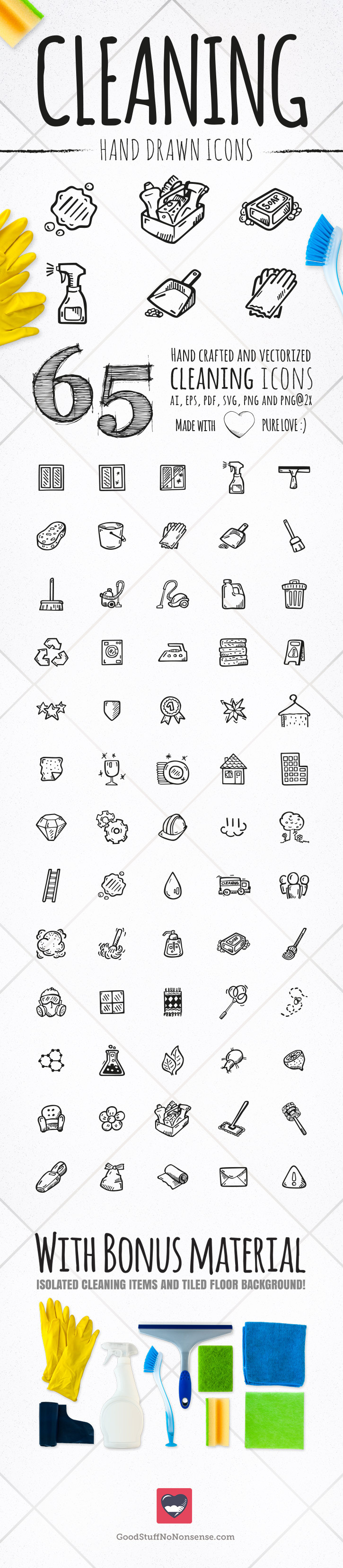 65 Hand Drawn Vector Icons Are you in cleaning business or even better making something for your client who owns a cleaning business? This set is tailored for you. You will find here everything that is useful to best illustrate what a cleaning business is about. This little illustrations will help you create friendly business infographics, flyers and website.