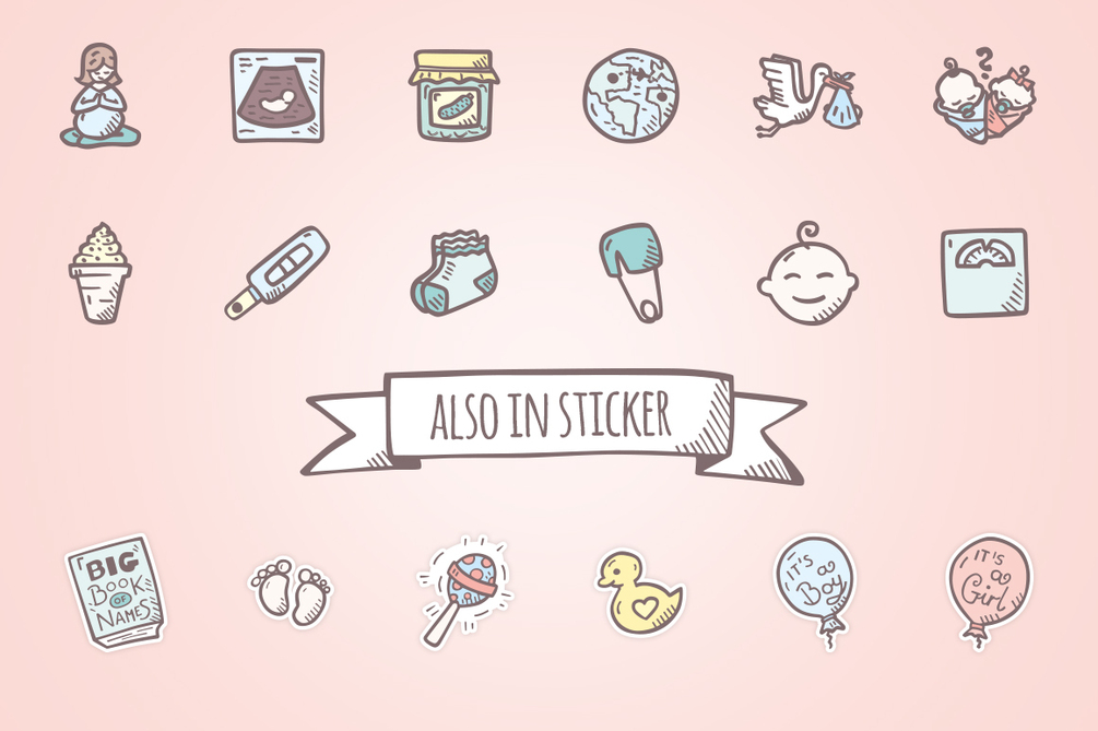A massive collection of beautiful and cute hand drawn icons, all about baby shower. This icon set will help you create super cute baby shower decorations, invitations and game cadrs. They are perfect as blog post illustration as they all come in SVG format. You will also be able to print your own stickers, as each icon have a sticker version.