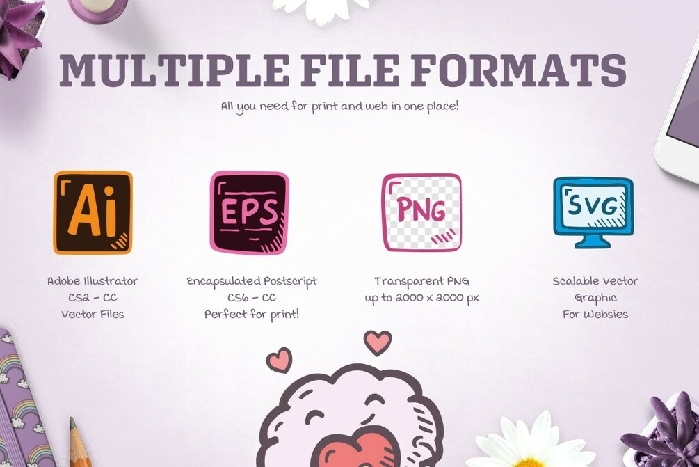 - Source files in AI, EPS, PDF, SVG format