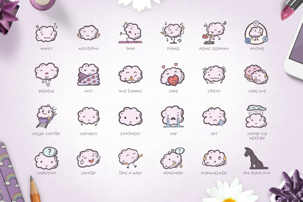 You'll find here a collection of icons illustrating self-care activities as well as some good advice on how to keep your sanity during difficult times. It includes a wide range of emotions, as well as comfort objects and activities. As a bonus, you'll be happy to find 15 Hand Drawn Pick-Me-Up badges.