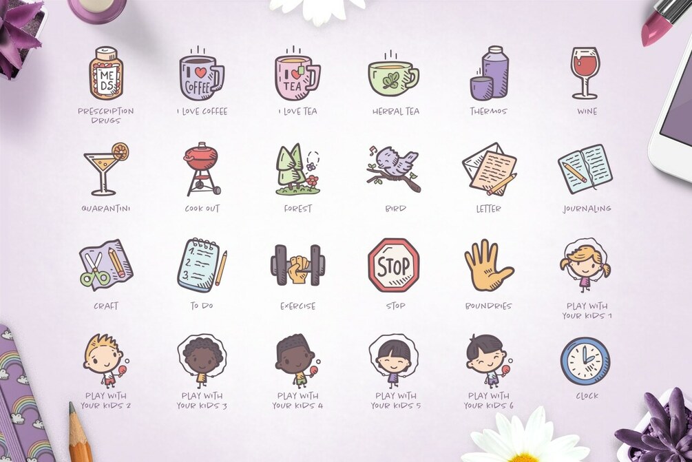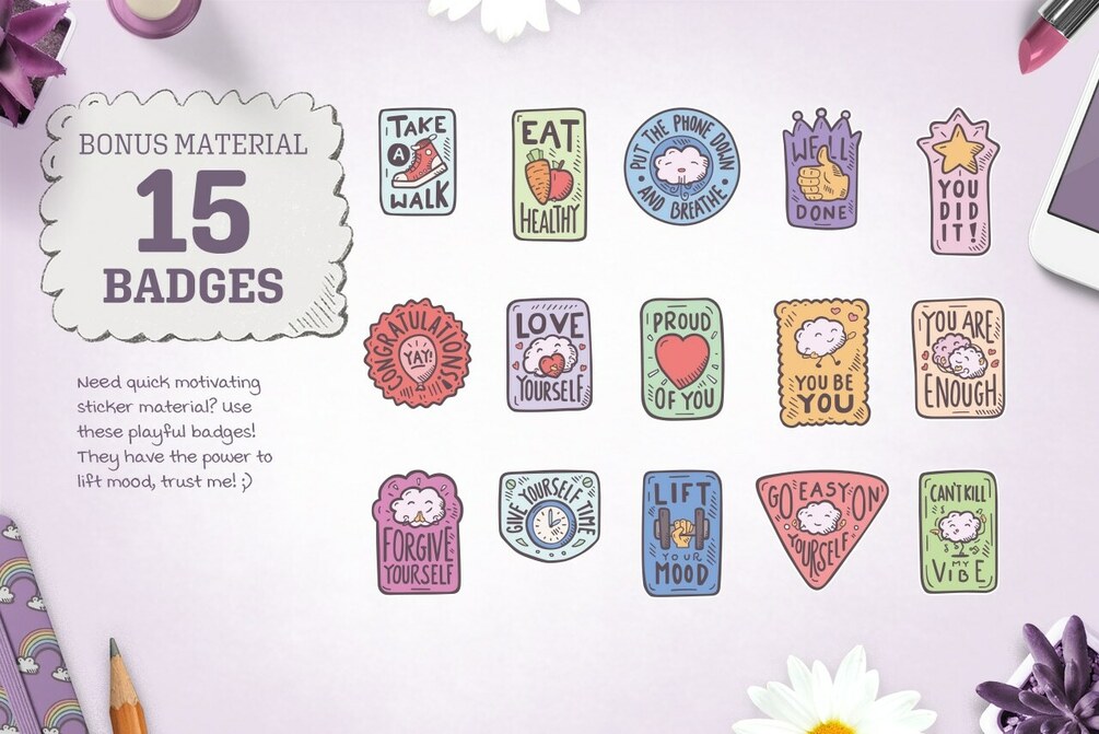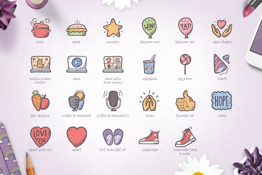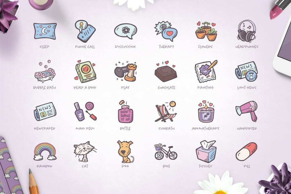 You'll find here a collection of icons illustrating self-care activities as well as some good advice on how to keep your sanity during difficult times. It includes a wide range of emotions, as well as comfort objects and activities. As a bonus, you'll be happy to find 15 Hand Drawn Pick-Me-Up badges.