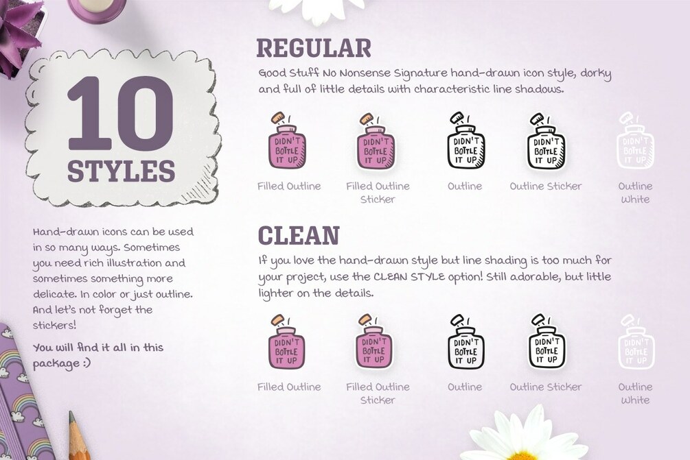 - Each icon in 10 different graphic styles