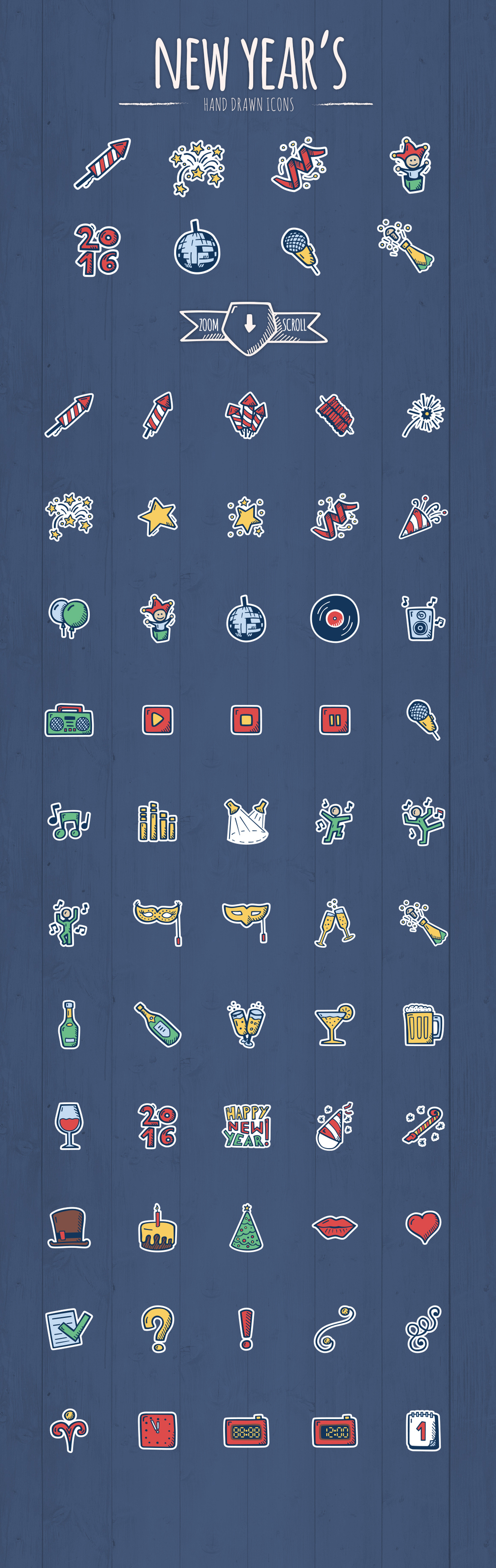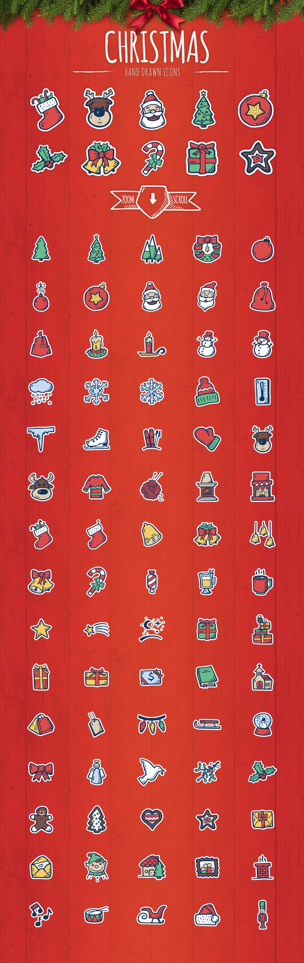 130 Hand Drawn Vector Icons. All about christmas spirit and new year’s celebration. You will find here wide range of icons, from christmas decoration, presents and food, to winter time icons. This carefully hand drawn icon set for the first time have 5 graphic styles. Full color and basic both in regular and sticker style. The basic version of new year’s icons is available for free.