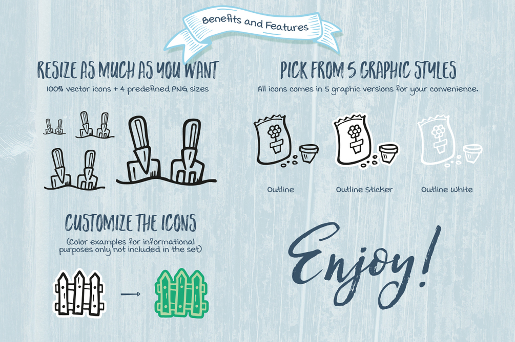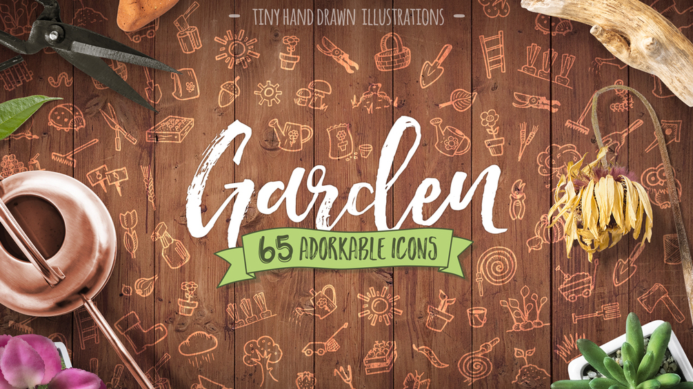65 Hand drawn icons all about gardening and plant cultivation. You will find here lots of gardening tools, as well as popular plants and small animals. This little illustrations will add fun and warm to your designs.