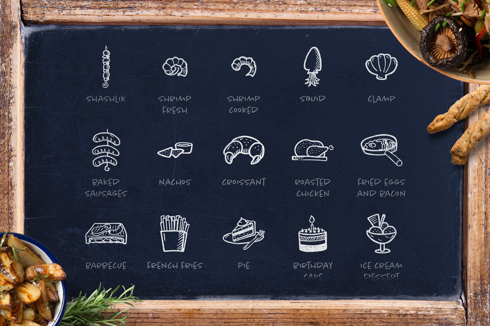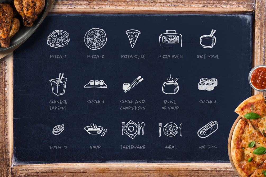 120 Hand Drawn Vector Icons all about food, bistro and restaurant and of course takeout!