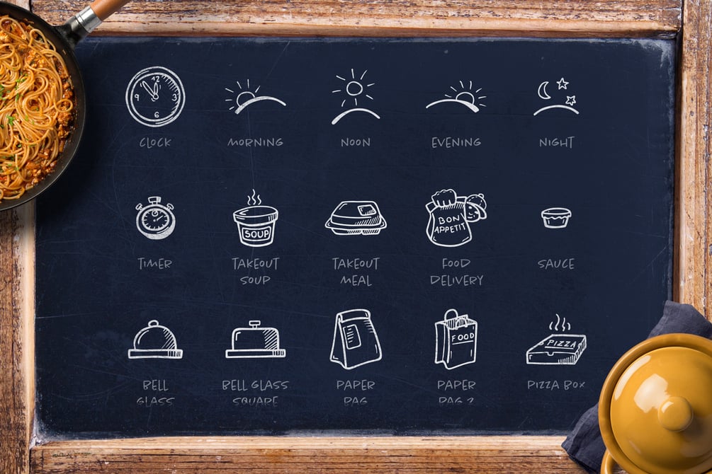You will find here various meals icons such as: chinese takeout, pizza, hamburgers, pasta, sushi and salads. Desserts and drinks as well as food preparation icons. Some super useful for takeout restaurants bags and boxes as well as delivery icons. And many other, extremely useful icons for your local restaurant website, such as: menu, envelope, reservation or localization. It’s a complete set of carefully hand drawn icons that will help you create unique and friendly looking designs.