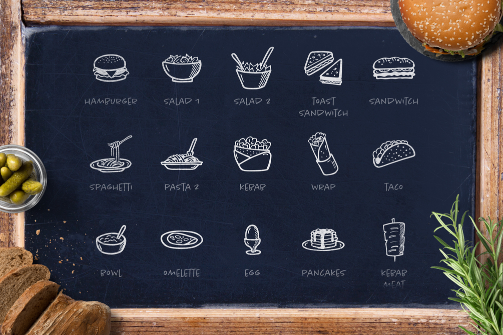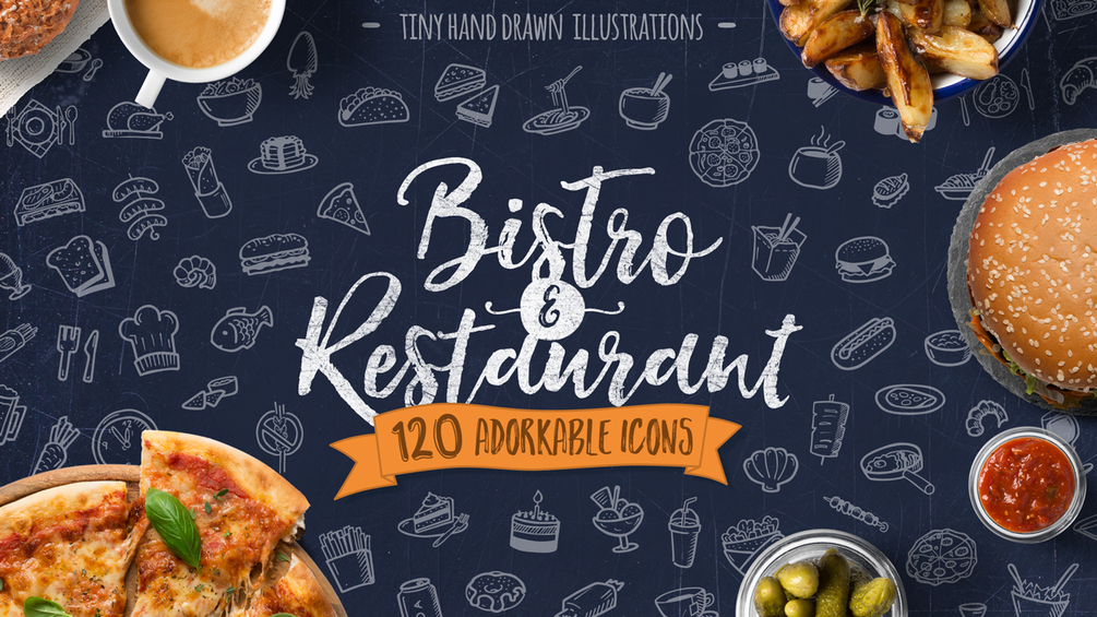 120 Hand Drawn Vector Icons all about food, bistro and restaurant and of course takeout!