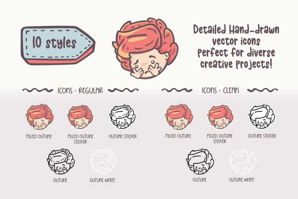 • Matching Icon in 10 Styles: One face expressed in 10 diverse styles, ranging from filled outlines to clean stickers.